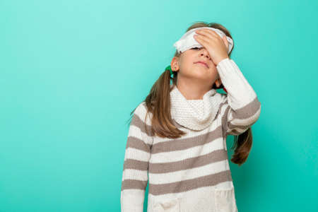 Little girl in a protective medical mask closes her eyes with her hands. The emotions of the child in the photo close-up. Copy space