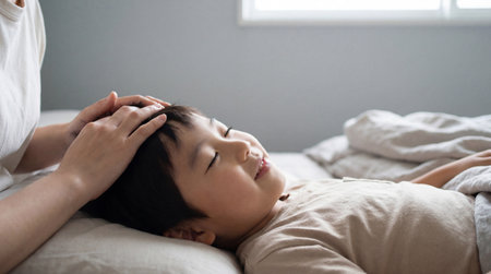 Asian mother gently comforting her son in bed during peaceful morning at home with soft natural window light.