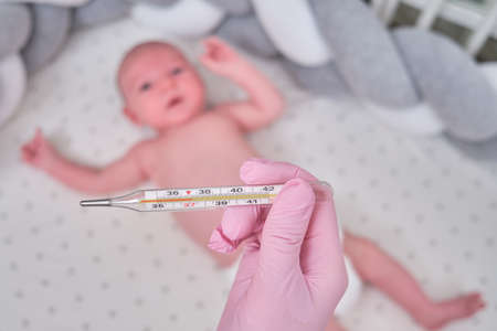 Doctor checks the temperature of the newborn baby with a thermometer. A nurse in uniform measures the child fever with a thermometer