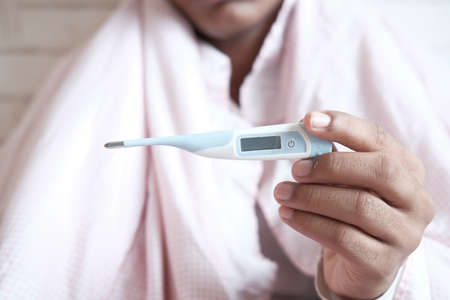 Sick man sitting on bed and checking thermometer after measuring his temperature