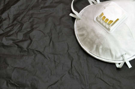 Mask with a valve for protection against coronavirus with copyspace on a black checkered background. Pandemic