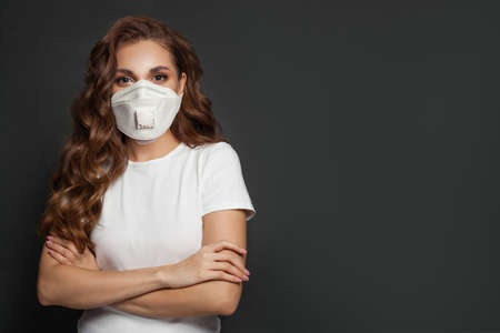 Confident woman in medical safety face mask on dark gray background. Woman in medical mask portrait