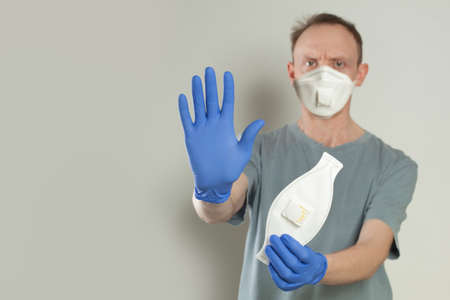 COVID-19 medicine, a man in a respirator and medical blue gloves