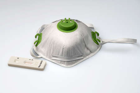 Covid-19 rapid antigen self test for diagnostic at home and a ffp2, ffp3 mask on a light background