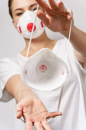 Woman hands holding a medical face dust filter mask. A lot of disposable FFP3 respirators. Concept of coronavirus covid-19, air pollution, virus, flu and infectious diseases. A stock face mouth masks.