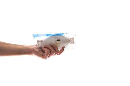 Man with protective 3M medical mask. 3M Aura 9312. The face mask used in the COVID-19 global pandemic as a protection against coronavirus in Bucharest, Romania, 2020