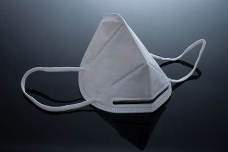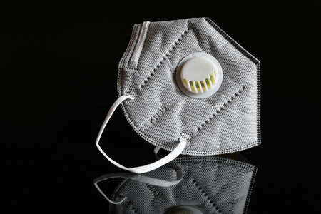 Close-up of gray ffp2 protective mask against covid-19 virus on black reflective background