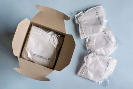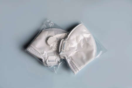 Protective medical dust face mouth masks, disposable FFP3 respirators in packaging. Concept of coronavirus, air pollution, virus, flu, infectious diseases and precautions. Blue background.