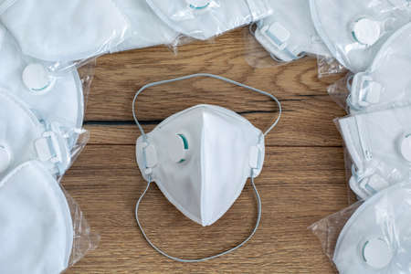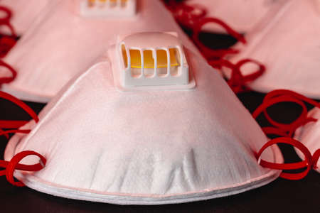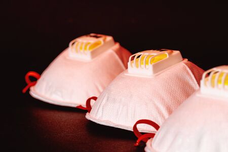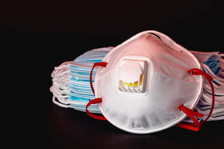 A lot of medical face dust masks, disposable FFP3 respirators protective mouth filter mask. Concept of coronavirus, sars, air pollution, virus, flu, infectious diseases and precautions. A stock masks.