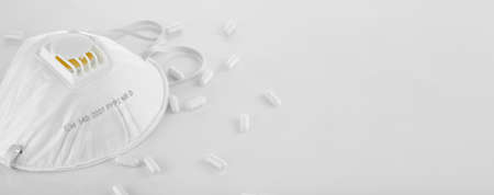 Highly effective respirator. Means of respiratory protection. Protective face mask means of protection against coronavirus infection, pneumonia, and respiratory diseases. medical respirator and pills.