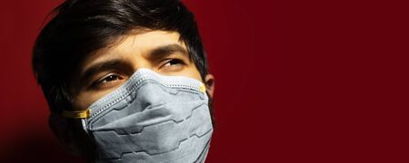 Studio close-up portrait of male face wearing medical flu mask, on background of dark red color with copy space.