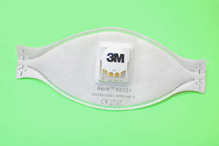 KYIV, UKRAINE - MAY 17, 2020: Respirator by 3M brand, level FFP3 on green background. Device designed to protect the wearer from inhaling hazardous atmospheres, including fumes, vapours, gases and particulate matter such as dusts and airborne microorganis