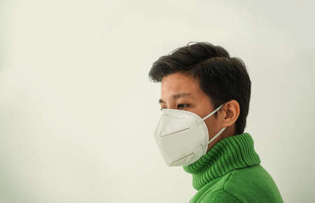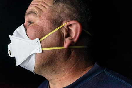Masked man in profile close-up. Side view of face. Medical respirator. White background with copy space.