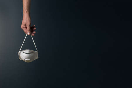 front view of single male hand clenched carrying corona virus protection mask by the elastic, set against dramatic dark background and lighting