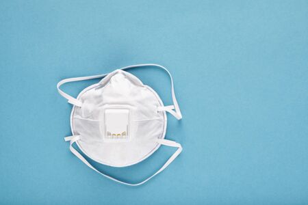 Protective medical dust surgical face mouth mask, disposable FFP2 FFP3 respirator. Concept of coronavirus, air pollution, virus, flu, infectious diseases and precautions. Blue background.