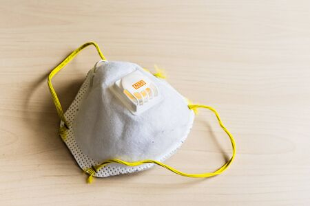 Used N95 respiratory mask discarded on a table; concept for the current PPE shortage in the battle against COVID-19