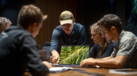 a man standing in front of a whiteboard with several people around him and pointing to it on the wall. Generative Ai