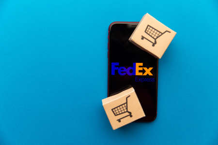 Kharkov, Ukraine - February 22, 2021: FedEx app logo of shipping company displayed on Apple smartphone screen, creative composition, copy space photo