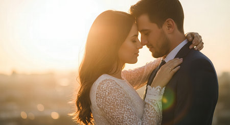 A tender moment of a newlywed couple embracing and smiling at each other, with a serene sea and sunset background, conveying love and happiness.