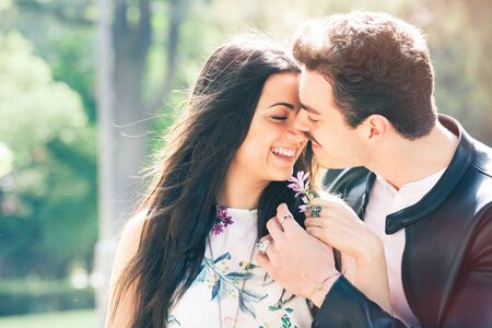 Young couple enjoying a romantic moment together in a beautiful park, bathed in the warm glow of the setting sun