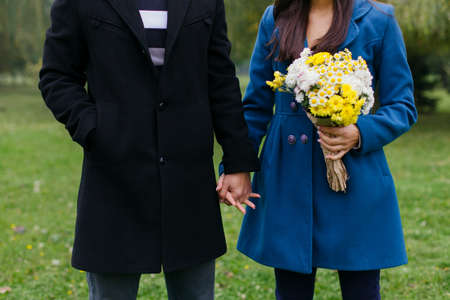 Concept of Valentines Day. Closeup of couple holding hands. Woman holding flowers