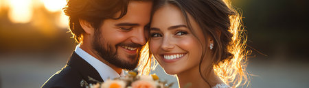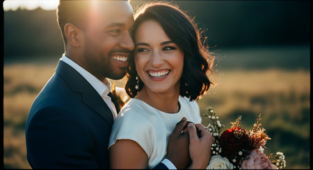 Smiling bride and groom holding flowers, soft lighting, joyful and intimate moment