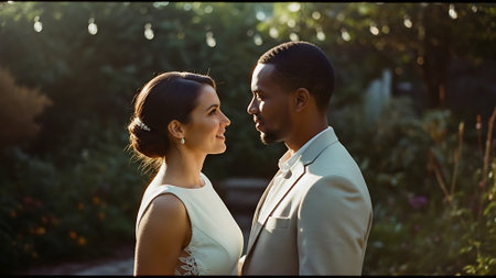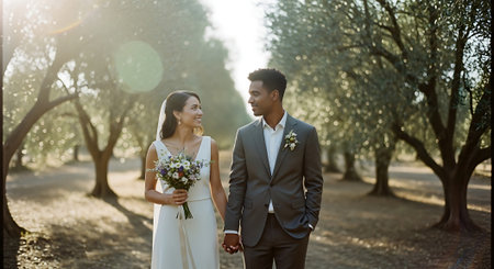 A smiling multi-ethnic couple, dressed in wedding finery, walk hand in hand through a lush green outdoor setting, surrounded by trees and warm sunlight.