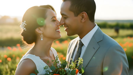 A smiling bride and groom, dressed in formal attire, walk hand in hand through a picturesque field of wildflowers, bathed in warm sunlight during sunset.