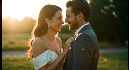 A smiling couple stands face-to-face in a serene field at sunset, the woman in a white off-the-shoulder dress and the man in a gray suit, conveying love and intimacy.