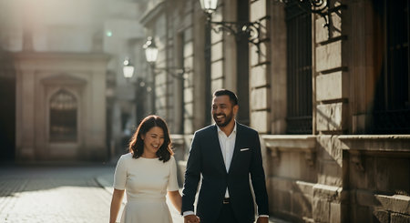 A smiling man and woman, dressed in formal attire, stroll together through a charming, sunlit city street lined with old buildings and street lamps.