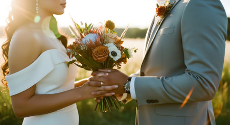 A bride in a white dress and a groom in a gray suit hold hands, with the bride holding a bouquet of orange, white, and green flowers, set against a blurred outdoor backdrop.