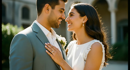 A smiling man and woman in wedding attire stand face-to-face outdoors on a sunny day, surrounded by greenery and buildings in the background, exuding happiness and love.