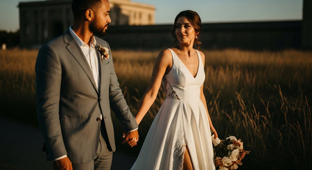 A happy newlywed couple walking hand in hand through a golden wheat field at sunset