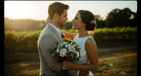 A loving couple, dressed in formal wedding attire, embracing and gazing into each other's eyes in a serene vineyard setting during a warm sunset.