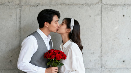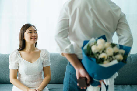 Happy Asian young couple in Valentine or anniversary stay together, man giving and surprise his wife a bouquet in their Valentine or Anniversary day. Husband and wife celebrating in Valentine day.