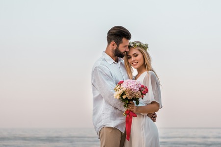 Beautiful couple in white. Future Groom and bride. bouquet of flowers