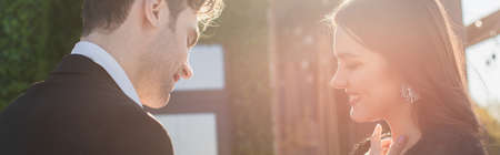 woman in faux fur jacket hugging elegant man in suit outdoors, banner