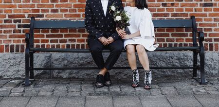 The bride and groom sit and gently stroke their hands to each other. Closeup of hands and wedding bouquet