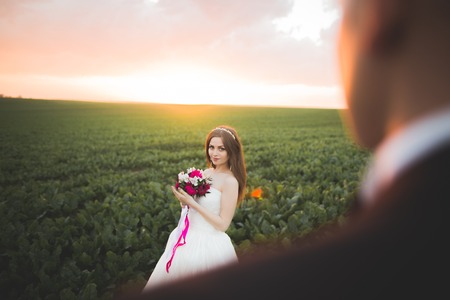 Beautiful wedding couple, bride and groom posing in field at sunset