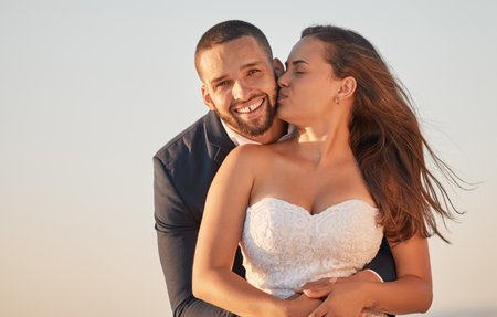 Wedding, bride and groom kiss portrait in romantic sunset ceremony to celebrate marriage in Mexico. Care, love and passion of married Mexican man and woman at celebration together with dusk sky.