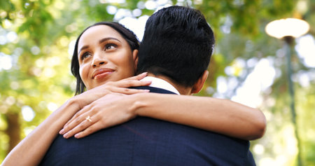 Bride, hug man and outdoor at wedding, smile and thinking for memory, milestone and relationship. People, embrace and excited woman with partner, commitment or marriage celebration at park in summer
