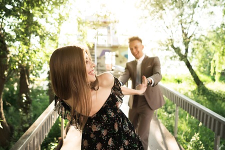 Lovers holding hands in summer park. Weddind day with beautiful classic style. Beautiful bride in white dress with roses bouquet.
