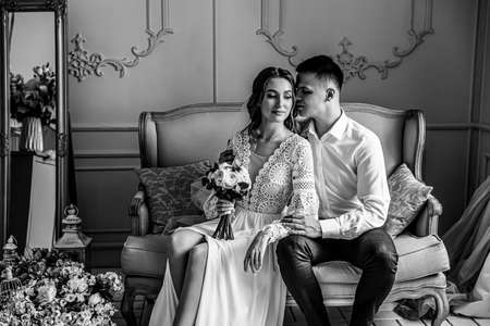 Bride and groom in studio. Man turns back to camera. Couple of lovers on dating