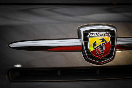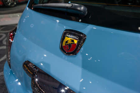 BELGRADE, SERBIA - MARCH 23, 2019: Detail of the Abarth car. Abarth is racing car and road car maker founded at 1949.