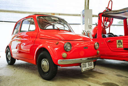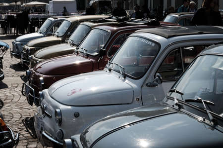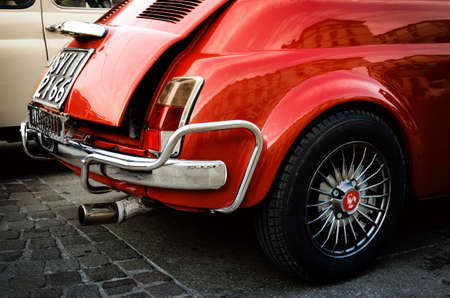 TURIN, ITALY - SEPTEMBER 24, 2017 - Old red Fiat 500 Abarth during a classic car rally in Vittorio Veneto Square, Turin (Italy) on september 24, 2017. Turin was the city where Fiat was born in 1899
