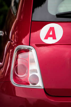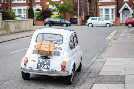 Bedford, Bedfordshire, UK June 2 2019. Classic Fiat 500 car with a picnic basket on a road in England. Shot from behind