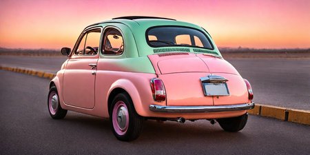 Pink and green retro car on the road at sunset in California.