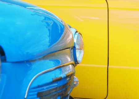 Headlight of a blue vintage car on the background of a yellow car