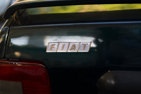 Salvador, Bahia, Brazil - December 02, 2023: Detail of the logo of an old Fiat car. City of Salvador, Bahia. remove; wheel