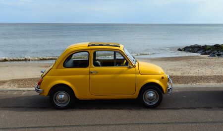 FELIXSTOWE, SUFFOLK, ENGLAND - MAY 06, 2018: Classic Yellow Fiat 500 parked on seafront promenade.